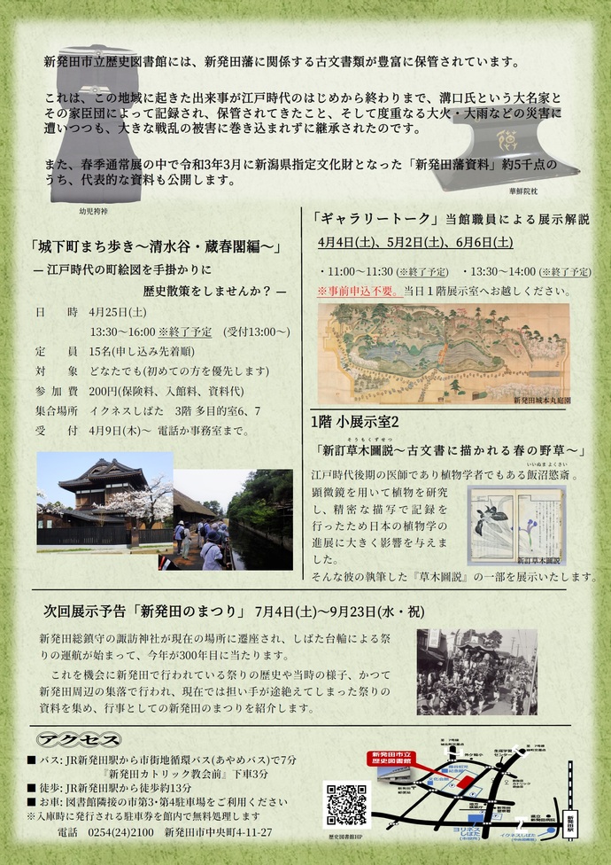 新発田市立歴史図書館には、新発田藩に関係する古文書類が豊富に保管されています。このうちの代表的な資料を公開いたします。また、職員による展示解説や、まち歩きイベントも行っています。詳細は歴史図書館のホームページをご覧ください。