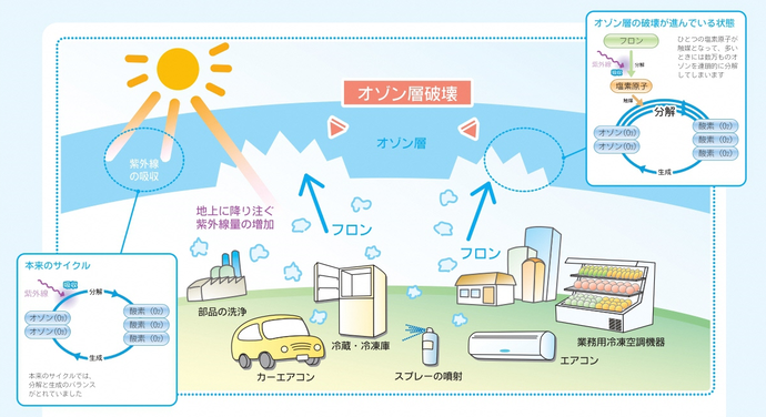 オゾン層を破壊する物質であるフロン類やオゾン層を破壊しない代替フロン類は、強力な温室効果ガスでもあり、地球温暖化係数は、二酸化炭素を1とした場合、124〜22,800にもなるそうです。