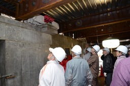上段の写真は、3階柱頭の免震装置(鋼製ダンパー)を見学している様子です。